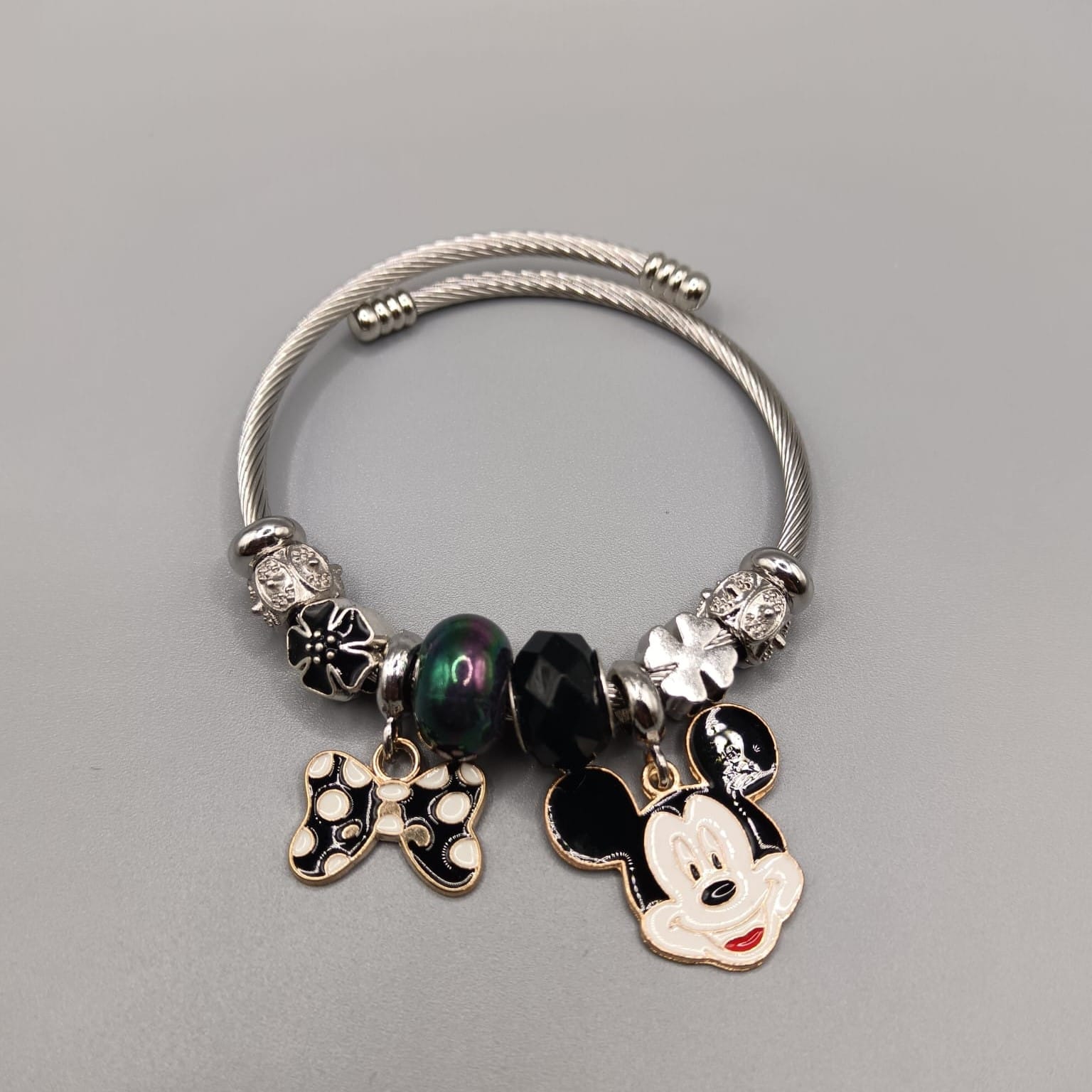 Brazalete rigida con charm de estilo juvenil de mikey en negro y color plata en acero hipoalergenico