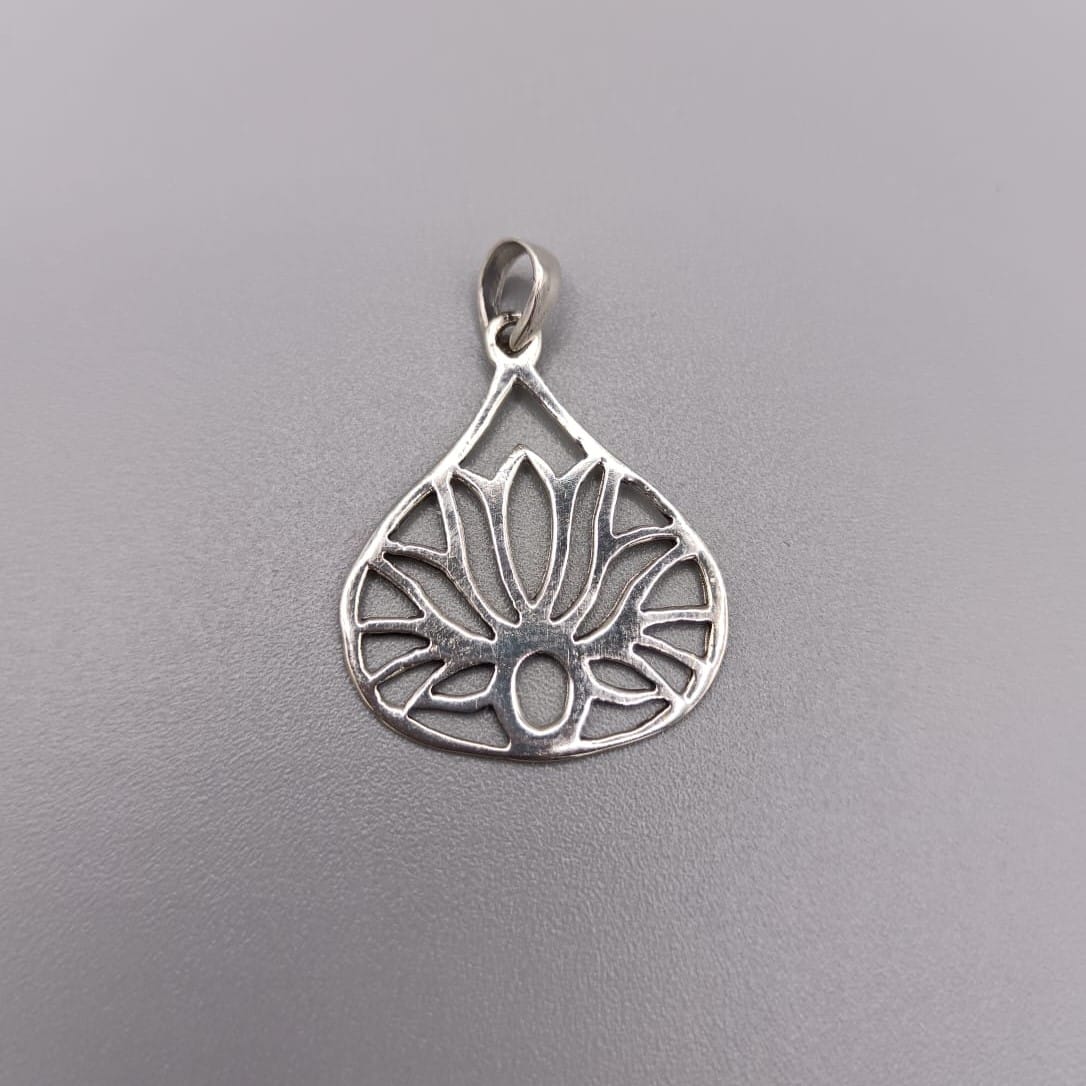 Colgante de plata de ley flor de loto. Mide 24 x 20 mm. Ideal para el día a día o para ocasiones especiales. En joyería Fenicios, Huelva.