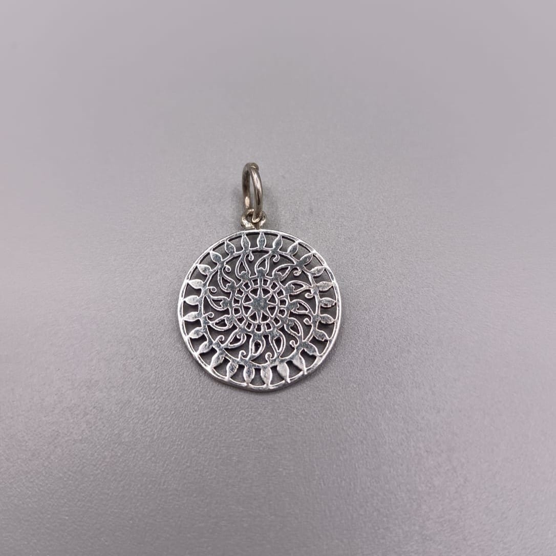 Colgante mandala rueda de la justicia de plata de ley. Mide 17mm. Ideal para el día a día o para ocasiones especiales. En joyería Fenicios, Huelva.